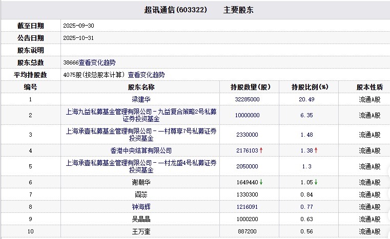 超讯通信主要股东显示,截至2025年9月30日,上海九益私募基金管理有限公司-九益复合策略2号私募证券投资基金为第二大股东,上海承壹私募基金管理有限公司-一村尊享7号私募证券投资基金为第三大股东,上海承壹私募基金管理有限公司-一村龙盛4号私募证券投资基金为第五大股东。